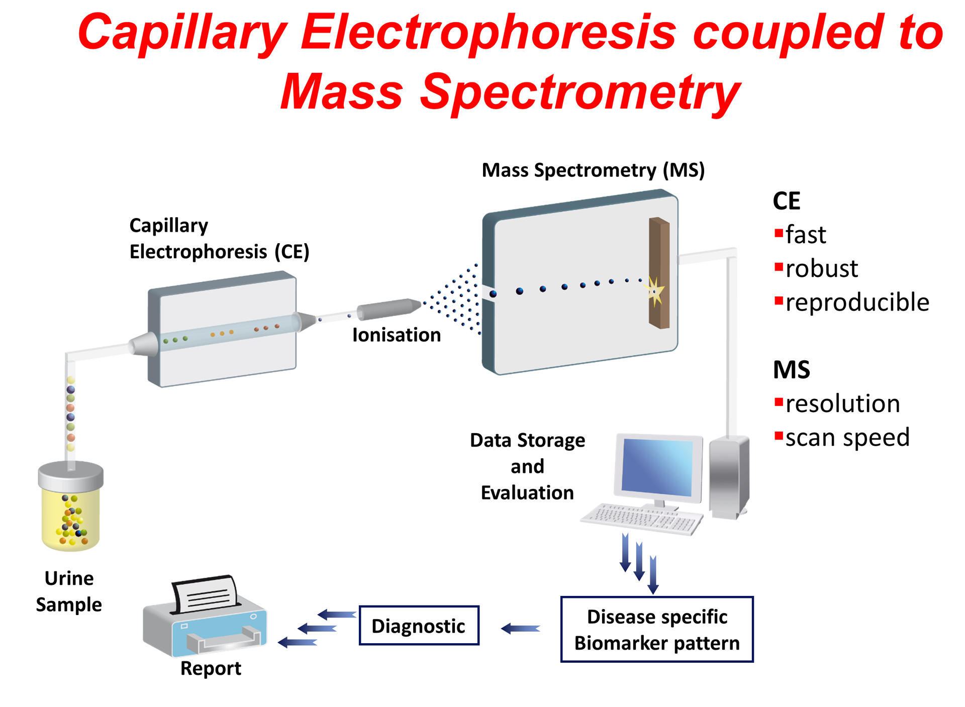The platform used is called capillary electrophoresis coupled to mass spectrometry (CE-MS) and was invented by Prof. Harald Mischak, the CEO of the company. CE-MS enables reproducible, robust and operator-independent high-resolution detection of up to 6,000 peptides (≥0.8 and ≤18 kDa) in one urine sample [1,2]. The robustness of the platform in terms of high precision (including inter-laboratory precision), reproducibility and stability were demonstrated in several applications [1,2].