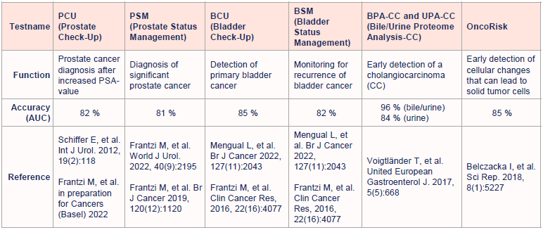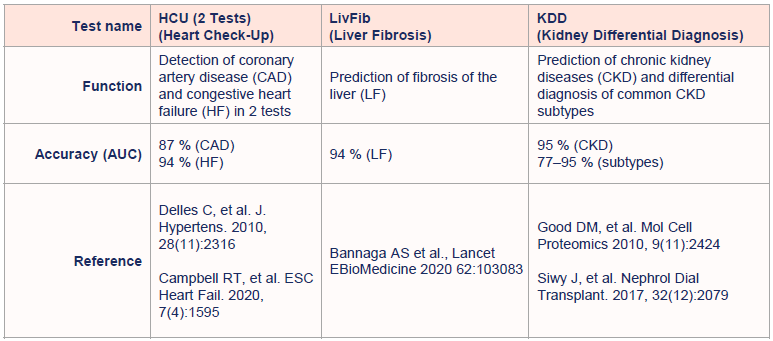 Using proprietary tools and algorithms, biomarker (polypeptide) signatures also called classifier can be developed for the diagnosis of pathological conditions. To date, several classifiers have already been developed covering different areas. For more information about commercially available classifiers, please visit this link (https://www.protexam.com/en-gb).