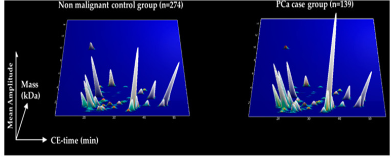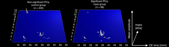 Mosaiques applies urinary profiling using capillary electrophoresis online coupled to mass spectrometry (CE-MS) to the non-invasive diagnosis of prostate cancer, to reduce the unnecessary biopsies and patients’ over-treatment and the associated costs. The urinary proteomic profiling of patients with prostate cancer and benign conditions (benign prostate hyperplasia- BPH) enables the identification of specific proteomic biomarkers that are combined in a diagnostic test (PCU -Prostate Check-Up- test) to enable efficient prostate cancer detection.