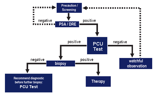 The PCU test is recommended for patients with suspicious PSA and/or digital rectal examination results prior to intended biopsy. The test allows distinguishing patients with a positive PSA test who have high probability for PCa from those who do not have it. A positive test result gives a clearer indication for a biopsy than PSA testing alone; whereas due to the high negative predictive value of >90%, in patients with negative test result biopsy is not indicated.