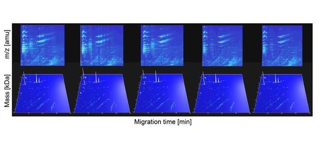 Figure 1: Reproducibility of urinary rat polypeptide evaluation. Examples of electropherograms obtained for 4 (of 19) consecutive measurements of a single urine sample. The m/z values of the 2-D raw data plots (upper panel) and the molecular weight (logarithmic scale) of the deconvoluted 3-D plots (lower panel) on the y-axis are plotted against CEmigration time on the x-axis. The arrangement of the analyzed peptides in distinct lines is obvious, and can be taken as a result of the number of positive charges at pH 2. The white arrow indicates 18.7-kDa signals probably representing major urine protein.