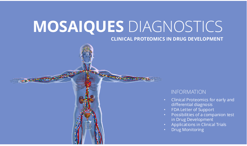 The CE-MS technology permits the definition of surrogate markers and endpoints in (pre)clinical trials, allowing evaluation of therapeutic strategies and new drugs on a small number of patients or even animal models. Mosaiques diagnostics has successfully implemented its technology in clinical trials in conjunction with international leading pharmaceutical companies such as Roche Pharma and Bayer Healthcare. Upcoming research projects include, among others, assessment of drug toxicity.