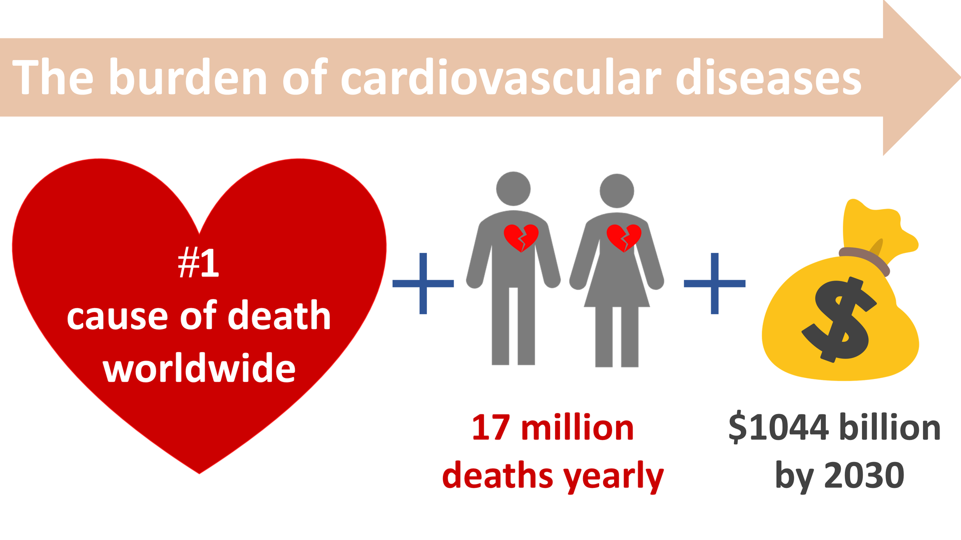 According to the World Health Organisation (WHO), CVD claim 17.7 million of lives yearly, altogether accounting for 31% of all global deaths. Usually considered to mostly affect the elderly population (≥ 65 years), the prevalence of CVD in young individuals (18-50 years) is rising [1]. This is due to the increase prevalence of risk factors among young adults living in the Western world. These risk factors include high blood pressure, diabetes mellitus, smoking, obesity and physical inactivity. The financial projections of the global cost for CVD were estimated at $1044 billion by 2030 [2]. Considering the burden of CVD, innovative methods to improve the management of CVD are urgently needed.
