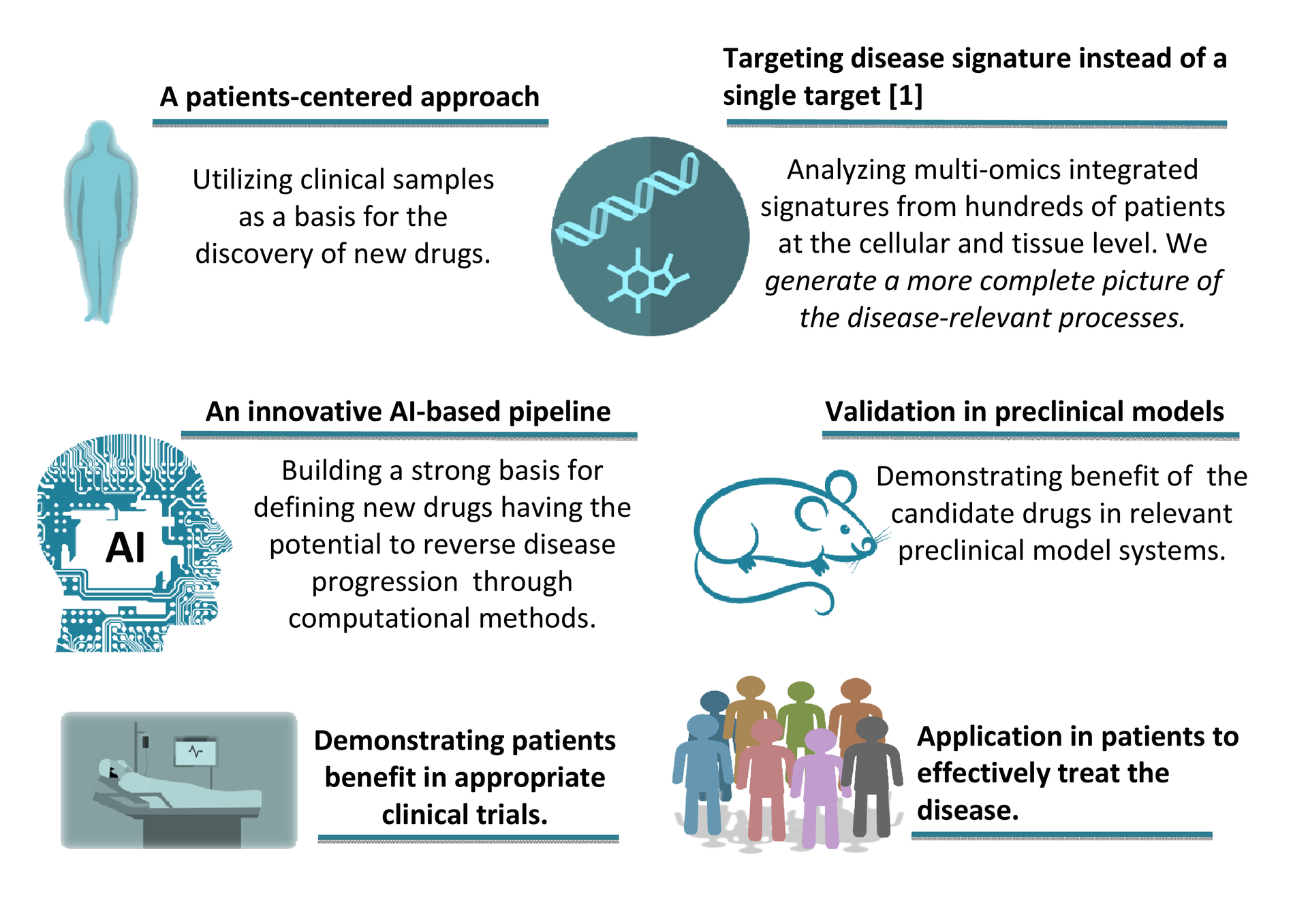 - Our pipeline builds on scientific and technological breakthroughs and AI algorithms to integrate high resolution multi-omics data. By this we enable rational selection of drug candidates based on underlying pathophysiology with emphasis on drugs already approved for different context-of-use.