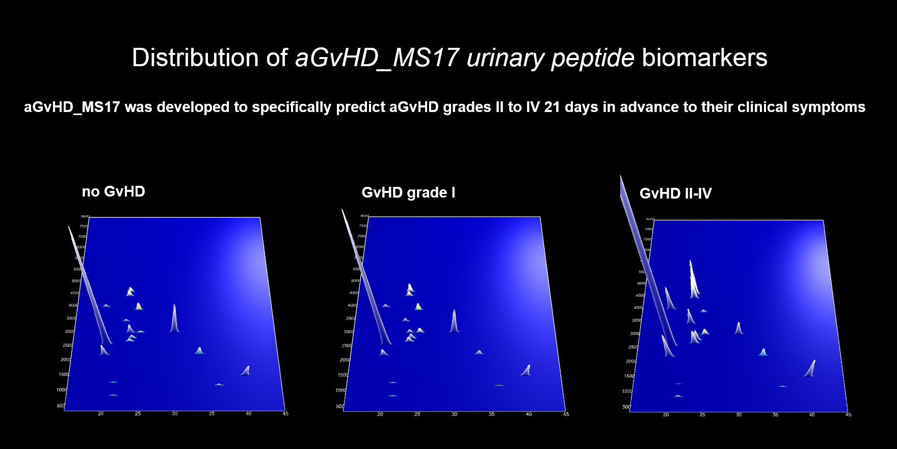 CE–MS has been applied to identify biomarkers for early detection of aGvHD in patients undergoing allo-HSCT since 2003. Mosaiques employed these biomarkers to generate an aGvHD-specific classifier, named aGvHD_MS17 that allow distinction of patients with severe aGvHD from those who never develop aGvHD and patients with low or moderate aGvHD.