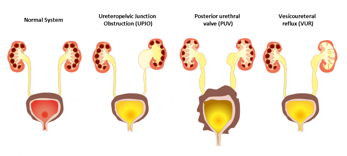 In pediatric nephrology, physicians are frequently confronted with congenital anomalies of the kidney and urinary tract (CACUT). CAKUT constitute approximately 20-30% of all anomalies identified in the prenatal period. Defects can be bilateral or unilateral, and different defects often coexist (Figure 1). Because CAKUT plays a causative role in 30-50% of cases of ESRD in children, it is important to diagnose these anomalies and initiate therapy to minimize renal damage, preventing or delaying the onset of ESRD, and providing supportive care to avoid complications of ESRD. CAKUT manifest as structural abnormalities of the kidney, including obstructive uropathy, renal dysplasia, and urinary tract malformations. CAKUT displays an extensive spectrum of prenatal and postnatal outcomes alternating from death in utero to normal postnatal renal function.