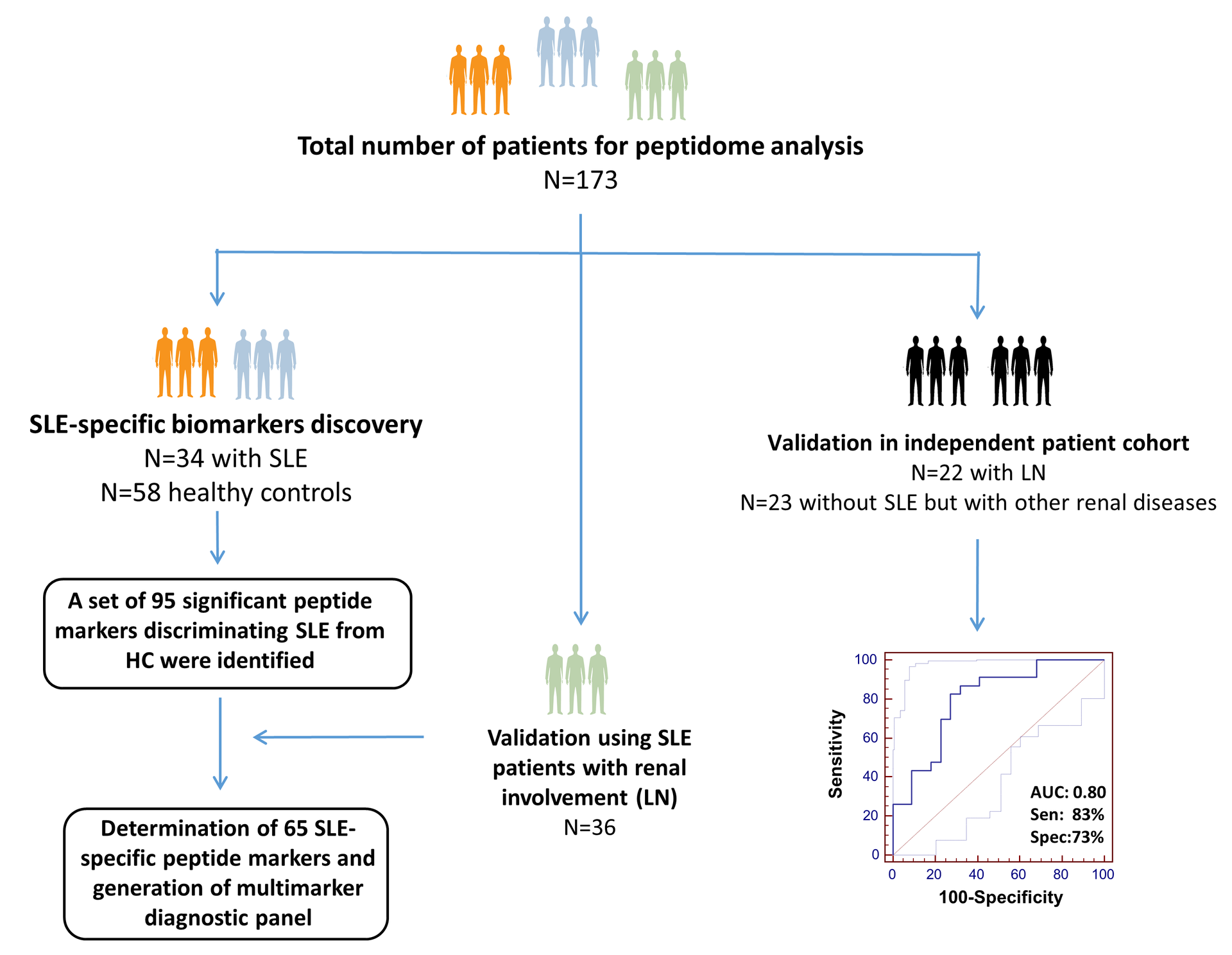 A panel of urinary peptide markers that reflected SLE without LN, additionally improving SLE diagnosis of these patients was constructed by conducting discovery and validation study on 34 SLE patients and 58 healthy individuals. A peptide marker panel composed of 95 peptide markers was established and further refined by using the peptide profiles of additional 36 LN patients to eliminate peptides cross-reactive with LN. In this way, a diagnostic classifier with 65 SLE-specific peptide markers was established and further validated in an independent test set of 23 LN patients and 22 patients without SLE, but with other renal diseases. The classifier achieved an AUC of 0.80, corresponding to a sensitivity and specificity of 83% and 73% at the best cut-off, respectively. The study workflow is shown in Figure 1.